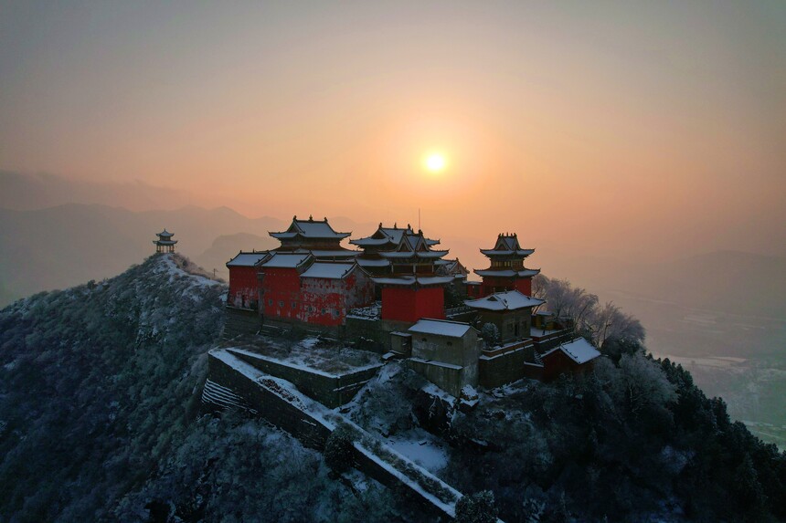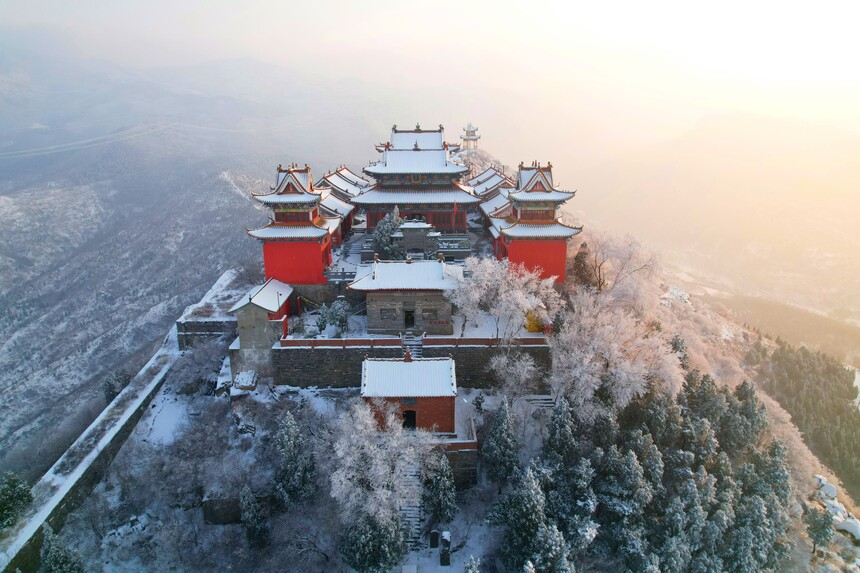 【乡村振兴信息网】元月19日,2026新年的第一场大雪,使洛阳市偃师区大口镇山张村的道教圣地牛心山如仙境一般,雾凇笼罩,红墙黛瓦,绿树白雪,美不胜收。陈鹏飞摄